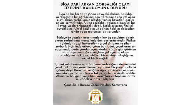 “Çanakkale Barosu olarak, akran zorbalığının önlenmesini çocuk haklarının korunmasının ayrılmaz bir parçası olarak görmekteyiz. Baromuz, mağdur öğrencimizin ve ailesinin yanında olacak, bu sürecin takipçisi olmayı sürdürecektir. Akran zorbalığına karşı tüm kurumları ve toplumu ortak mücadeleye davet ediyoruz.”