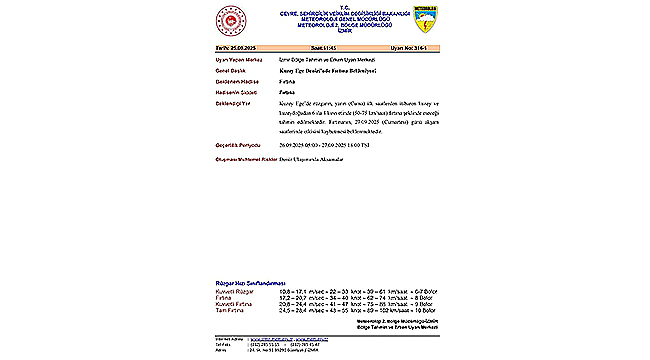 Yapılan açıklamaya göre, 26 Eylül 2025 Cuma günü sabah saatlerinden itibaren rüzgarın kuzey ve kuzeydoğu yönlerinden 6 ila 8 kuvvetinde, yani saatte 50 ila 75 kilometre hızla fırtına şeklinde eseceği tahmin ediliyor.