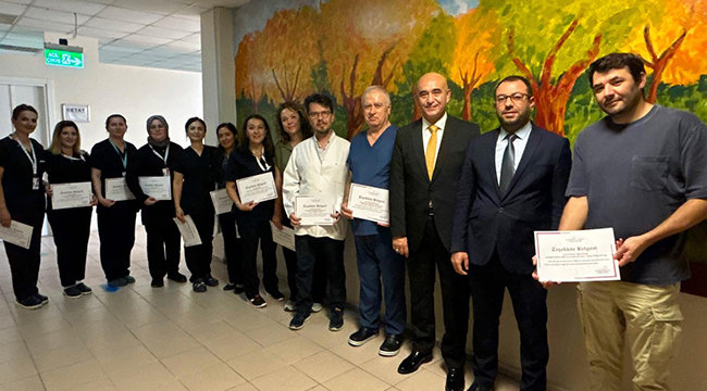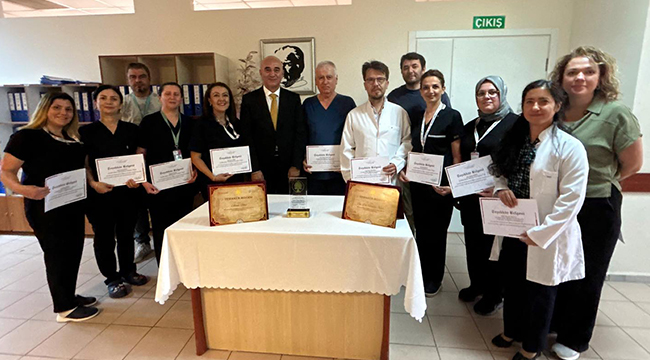Çanakkale İl Sağlık Müdürü Dr. Hakan Görgülü, Geleneksel Tıp ve Tamamlayıcı Tıp (GETAT) uygulamaları alanında Türkiye’nin en başarılı ilk 10 hastanesi arasına giren Mehmet Akif Ersoy Devlet Hastanesi GETAT Ünitesi ekibine teşekkür belgelerini takdim etti.